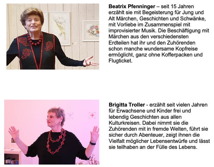 Das lebendige Erzählen im Kontakt mit dem Publikum spielt in der Erzähltradition eine bedeutende Rolle. Beatrix Pfenninger und Brigitta Troller erzählen frei aus ihrer inneren Bilderwelt heraus und ermöglichen dadurch den Zuhörenden eigene Bilder zu kreieren.