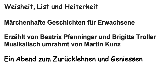 Märchen werden oft den Kindern zugeordnet. Damit wird man ihnen aber nicht gerecht. Märchen sind entstanden durch das Weitererzählen in einer Zeit, wo noch nicht zwischen Kinder- und Erwachsenengeschichten unterschieden wurde und es keine andere Unterhaltung gab. Sie wurden in allen Kulturen in den Zelten, Hütten, Webstuben oder am Feuer erzählt. Auf diese Weise entstand das Gefühl von Zusammengehörigkeit und Geborgenheit. Traditionen, Weisheiten und Werte wurden weitergegeben und aktuelle Ereignisse verarbeitet. Durch humorvolle Geschichten lernten die Zuhörenden Geschehnisse zu relativieren und gemeinsam darüber zu lachen!
